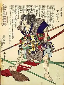 He fought bravely against Kato Kiyomasa in the Siege of Udo, killing Kato's senior retainer. After he found out the western army had been defeated, he decided to surrender. He committed seppuku in exchange for assurances that all his vassals would be spared and hired with the same salary.[1]