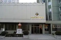 Located in between the Koryo Hotel[7] and Pyongyang station, the Korea Stamp Museum is situated in a three floor building with awards from philatelic exhibitions housed in the ground level,[8] a souvenir shop on the second floor, and an exhibition hall on the third floor.[9] The exterior of the museum after its renovation was built to resemble a postage stamp and has a bronze statue of a dove holding a postcard while flying above the Earth located outside the building.[8] The museum functions more as a shop than a museum to attract international tourists [10] and philatelists despite the limitations of international sanctions.[11][12]