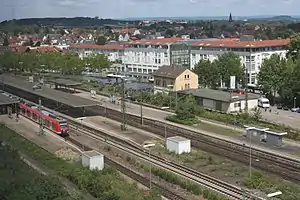 Kornwestheim station is located in the Ludwigsburg district of Kornwestheim in the German state of Baden-Württemberg. It is located on the Franconia Railway (German: Frankenbahn) and is a station on the network of the Stuttgart S-Bahn. It is near the junction of the Untertürkheim–Kornwestheim line (Schusterbahn) freight bypass. Kornwestheim passenger station was the site of a Deutsche Bahn car train loading facility until December 2007.