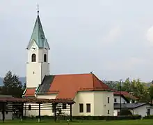 There are two church buildings in Koseze. The older structure, originally dedicated to Saint Margaret, is one of the oldest churches in the immediate Ljubljana area[9] and dates back at least to the 14th century[1][10] and the exterior has frescoes dating to the first half of the 15th century.[9] A bell tower was added to the church in 1708, and the building was badly damaged in the 1895 Ljubljana earthquake.[10] The church was repaired between 1907 and 1908.[1][10] Ljubljana–Koseze became a parish in 1961, when it was separated from the Parish of Šentvid, and the church was rechristened as Divine Savior Church.[11] The interior of the church was renovated by the architect Anton Bitenc (1920–1977) circa 1973.[9] The medieval church was too small to serve the needs of the parish, and so a larger church was built next to it from 1972 to 1974.[12] Dedicated to the Virgin Mary, this was the first church built in Ljubljana after the Second World War.[13] The new church was designed by Anton Bitenc[4][12][14] with extensive stained glass by Stane Kregar (1905–1973).[14]