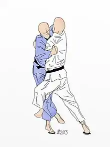 Kosoto Gake (小外掛), sometimes known as "minor outer hook", the English translation, is one of the original 40 throws of Judo as developed by Jigoro Kano. It belongs to the third group, Sankyo, of the traditional throwing list, Gokyo (no waza), of Kodokan Judo. It is also part of the current 67 Throws of Kodokan Judo. It is classified as a foot technique, Ashi-waza. It is often used as a counter-throw to tai-otoshi, after having stepped over the leg. To perform the technique, the tori grabs uke using one of several compatible grips - the traditional example being the sleeve collar grip. He then steps forwards diagonally to place all of uke's weight on the foot tori wishes to reap. This leg is reaped by wrapping the leg around his leg from the outside (doing it from the inside is Ōuchi gari) and plucking the ankle or calf upward with the back of tori's own ankle or calf respectively. Because the weight was planted on this foot due to off-balancing uke, tori can make him fall. If uke's weight is not on the leg being swept, uke will remain stable and be able to keep his balance. This should all be done in a fluid motion so that uke's weight is moving backwards whilst the leg is being reaped, otherwise it will be too heavy to lift although the throw can still work sometimes from this position.