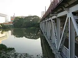 Kota Bridge, Klang or Jambatan Kota, Klang is the first double-decked bridge in Malaysia. It is located over the Klang River in the city of Klang, Selangor. The longer upper deck was built for motorised vehicle traffic, while the shorter lower deck was used for pedestrians and bicycles only. The bridge originally had a span of 1,438 feet (438 m), but part of the bridge has been removed to allow for the construction of a new bridge alongside it. The upper deck has been converted to a public space and no longer permits automobile traffic, but the lower deck is still open to pedestrians, bicycles and motorcycles.