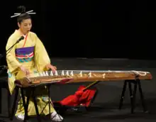 The koto (箏) is a Japanese plucked half-tube zither instrument, and the national instrument of Japan. It is derived from the Chinese zheng and se, and similar to the Mongolian yatga, the Korean gayageum and ajaeng, the Vietnamese đàn tranh, the Sundanese kacapi and the Kazakh jetigen.[1] Koto are roughly 180 centimetres (71 in) in length, and made from Paulownia wood (Paulownia tomentosa, known as kiri). The most common type uses 13 strings strung over movable bridges used for tuning, different pieces possibly requiring different tuning. 17-string koto are also common, and act as bass in ensembles. Koto strings are generally plucked using three fingerpicks (tsume), worn on the first three fingers of the right hand.