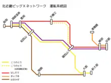 Kounotori, Kinosaki, Hashidate, Maizuru, and Hamakaze constitute the Kitakinki Big X Network of limited express services connecting the northern Kinki (Kitakinki) region with the Keihanshin metropolitan area.