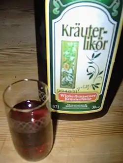 The history of Kräuterlikör recipes dates back to medieval authors like Hildegard of Bingen. Mixtures of alcohol and bitter substances were used as medicine to increase bile and gastric acid secretion. Nowadays, Kräuterlikör is also served as an ingredient of different cocktails and long drinks.[1]