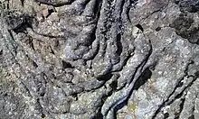 The lavas of Kapelluhraun ([ˈkʰaːpɛtlʏˌr̥œyːn], "chapel lava") from historical time (erupted around 1150)[12] have been given this name because of a medieval chapel whose ruins are still standing on them. A small statue of Saint Barbara was found at the place.[13] The Kapelluhraun lava field consists of pāhoehoe and ʻaʻā lava which streamed from the highland down to the bay of Straumsvík near today’s aluminium smelter and there into the sea.[12] The events were part of a ca. 30 years long unrest period in the late 12th century which is called Krýsuvík Fires. This unrest period included repeated eruption series and rifting episodes and is recorded in Flateyjarbók.[12]