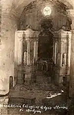 The church interior was almost fully demolished.[8] Sculptures were smashed, paintings had bullet holes. Priests moved two side altars to the church in Maironiai and some other items to the parish church in Kražiai, but many other items were looted. The church was left essentially empty and was closed, but not demolished. It was returned to the parish in 1908 and, after extensive repairs, reopened on 4 September 1910.[8] Other monastery buildings, except for the chapel of St. Roch, did not survive.[1] The wooden Church of the Archangel Michael burned down in June 1941.[11]
