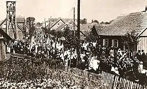 Kražiai massacre (Lithuanian: Kražių skerdynės) was an attack by a Russian Don Cossack regiment on Lithuanians protesting the planned closure of a Roman Catholic church in Kražiai, then part of the Russian Empire, on 22 November 1893. As part of wider Russification efforts, the Tsarist government decided to close the women's Benedictine monastery in Kražiai. The locals petitioned to keep the monastery's Church of the Immaculate Conception open and transform it into a parish church. The Tsar ordered the monastery closed and demolished in June 1893. The locals started a constant vigil inside the church, protecting it from members of the clergy who tried to comply with the orders. On 21 November, Governor of Kaunas Nikolay Klingenberg personally arrived to the town to supervise the closure. Lithuanians resisted and overpowered 70 policemen that Klingenberg brought with him. The next morning, about 300 Don Cossacks arrived from Varniai and were given a free rein to loot and brutalize. According to official data, nine people died and 54 were injured.[1] At least 24 women were raped and 16 men flogged with nagaikas. 71 persons were put on trial for rioting and disobeying police orders, but the cruelty of the Cossacks caused a public outcry and the people received a pardon from the Tsar. The event became a rallying cry of the Lithuanian National Revival.[2]