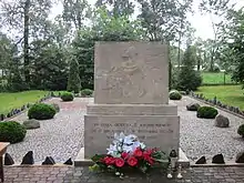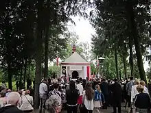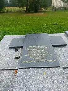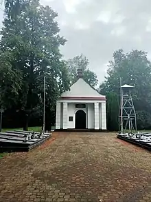 Following the war, the village underwent partial reconstruction.[16] Shortly after the German occupation ended, the burial site of the victims was enclosed and marked with a birch cross. Fr. Józef Kaczyński, who lost his mother and three siblings during the pacification, made significant efforts to commemorate the events of July 1943.[3] He and other survivors began compiling a list of victims shortly after the massacre.[35] At the priest's initiative in 1946, a chapel-mausoleum was constructed in Krasowo-Częstki, placed near the location of the two mass graves. Inside the chapel, there are two plaques, one bearing the names of the victims and the other listing the survivors. An altar with a replica of the painting of Black Madonna of Częstochowa, as well as display cases containing fragments of burnt farm boards and photographs of the village and its inhabitants, many taken by Fr. Kaczyński shortly before the massacre, can be found within. Every year on 17 July, masses are held in remembrance of the victims.[36]