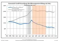 Development of population since 1875 within the current boundaries (Blue line: Population; Dotted line: Comparison to population development of Brandenburg state; Grey background: Time of Nazi rule; Red background: Time of communist rule)