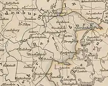 On April 1, 1819, the district boundaries were changed again. The parishes of Barten, Drengfurth and Groß Wolfsdorf were transferred from the Gerdauen district to the Rastenburg district and the Bartenstein, Falkenau, Gallingen and Groß Schwansfeld parishes were transferred from the Rastenburg district to the Friedland district.[1]