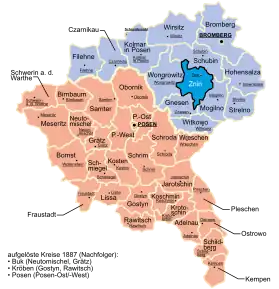 Gutenwerder district was created in 1876 from Znin district (Schubin County). Mittelwalde district was created in 1890 from Rogowo district and Klein Laski district was created from Gonsawa district. Herrnkirch district was created in 1899 from Janowitz district. Birkenfelde district was created from Gutenwerder district. Lasskirch district was created in 1905 from Janowitz district and Woycin district was created from Znin district. In addition, the following cities were separate districts for urban residents: Rogowo, Znin.