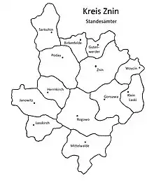 Standesamt is the German name of the local civil registration offices which were established in October 1874 soon after the German Empire was formed. Births, marriages and deaths were recorded. Previously, only duplicate copies of church records were used. By 1905, Kreis Znin had the following 13 offices for rural residents:[1]