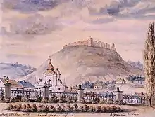 Kremenets Castle (Ukrainian: Кременецький замок, Lithuanian: Kremenecio pilis, Polish: zamek w Krzemieńcu) is a castle situated in the city of Kremenets, Ternopil Oblast, Ukraine. The castle was built of limestone on a steep hill. The keep located on its west side, and its width was 65 metres (213 ft) and length of 135 metres (443 ft). All the elevation was surrounded by a tall stone wall, and in the earlier ages of the 13th century wood as building material was used instead.