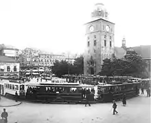 KSS had a concession which expired in 1905, at which time the municipality could purchase the company at par value. This raised a new debate concerning public or private operations, with many Conservative politicians calling for the privatization of KKS.[27] In the 1904 municipal election the issue was raised, with the Liberal Party and the socialist parties running for municipalization of tram operations. Meanwhile, the municipal administration worked with estimates for taking over KSS. A take-over would cost the municipality about NOK 2 million, while a sale would bring in about NOK 1.6 million. However, as KSS was a profitable company, it was estimated that the municipality would make more money by taking over KSS than selling KKS, estimated at about NOK 3 million for the period in question. The decisive municipal council meeting was held on 14 April 1905, although the actual vote did not occur until 02:00 hours the following day, after a nine-hour debate.[28] The Conservative majority voted in favor of selling KKS to KSS and extending the latter's concession to 1924.[29]