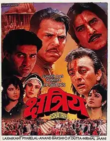 Kshatriya (transl.Warriors) is a 1993 Indian Hindi-language action film directed by J. P. Dutta. It features an ensemble cast of Sunil Dutt, Dharmendra, Vinod Khanna, Sunny Deol and Sanjay Dutt, with Rakhee Gulzar, Meenakshi Seshadri, Raveena Tandon, Divya Bharti and Sumalatha. Sunil Dutt and Dharmendra play fathers to their real-life sons Sanjay Dutt and Sunny Deol respectively although Sunil and Sanjay do not share screen space. It also marks the last time that Dutta would collaborate with Laxmikant Pyarelal