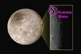 Kubrick Mons has a diameter of 40 kilometres (25 mi) and is 3–4 kilometres (1.9–2.5 mi) in height.[3] The feature is surrounded by a moat which has a depth of 1–2 kilometres (0.62–1.24 mi) below the surrounding area.[4] It is not currently known how Kubrick Mons formed; however, there is speculation that Kubrick Mons may be a cryovolcano and the depression may be the result of a shrinking chamber of water and ammonia.[3] As of November 2019 this hypothesis remains unconfirmed.