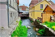 Kuldīga is an ancient town in Latvia's western region of Kurzeme with distinctive architecture, which is included in the list of the UNESCO's World Heritage Sites.[9] Saint Catherine is believed to be the patron saint of Kuldīga, and the oldest church of the town is named after St Catherine. The foundation of the building was laid as early as in 1252. The church has been remodeled a number of times. The small River Alekšupīte runs through the very centre of the Kuldīga old town, along the walls of the houses. The Old Town around the small river itself is the only remaining 17th–18th-century ensemble of this kind in the Baltic states. A 4.2 metres high waterfall on the Alekšupīte is the highest in Latvia.[10] The Venta Rapid, a 240-meter wide natural rapid is the widest in Europe. Not far from the rapid is the Kuldīga brick bridge built in 1874, which is the longest bridge of this type in Europe.[11]