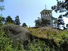 The separate belfry, completed four years before the church itself, and standing c. 30 metres (98 ft) from the church building, was initially designed by Armas Lindgren, and completed after his death by his daughter, architect Helena Stenij.[2][1]