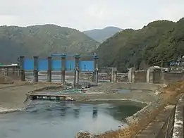 In the past, there have been constructions of three dams on the mainstream of Kuma River, which are, in the order from the estuary, the Arase dam, the Setoishi dam and the Ichifusa dam. The completion of the Arase dam was in 1955, the Setoishi dam in the 1958, and the Ichifusa dam in the 1959.[13] The Arase dam was constructed as the first step of the Kuma River General Development Project in 1951. The Arase dam was built on the Kuma River for the purpose of hydropower generation and control of water levels and flooding.[3] Setoishi dam was constructed by an electric power company, at the upper stream of the Kuma River. Ichifusa dam was built by the Kumamoto Prefecture government, also at the upper stream of the Kuma River for water supplies of its neighbourhood.[14]