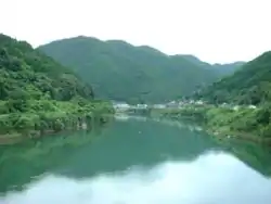The Kuma River and its watershed covers nearly 25% of the entire area of Kumamoto Prefecture, and it is the largest river in the prefecture.[3] The Kuma River begins its course from Mount Choushigasa flowing primarily through Kumamoto prefecture, leading to the Yatsushiro Bay. It is the only major and the largest river connected to the Yatsushiro sea. Before flowing into the Yatsushiro sea, where a large tidal flat is formed at its river mouth. Before flowing into the Yatsushiro sea, the Kuma River flows through the Hitoyoshi city, the Kuma village and the Yatsushiro city.[4] The Kuma River flows through the Shimanto terrane and mainly through the Chichibu terrane.[5] The Kuma River has 80 tributaries with its combined total length of 434 km. One of the major tributaries of Kuma River is Kawabe River, joining Kuma river at Hitoyoshi city, Kumamoto prefecture.[5] The sediments of Kuma River originate from the Chichibu terrane and the Higo volcanic.[6]