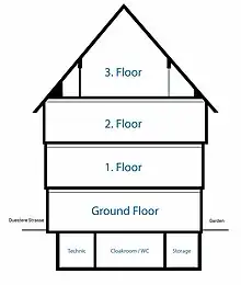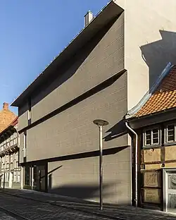The completed, externally three-story Kunsthaus is based on historic Göttingen half-timbered houses in its closed construction, the building cubature, the gable roof as a roof form, and the floors that project twice toward the top. The linear structure of the horizontal modeling plaster is intended to be reminiscent of "stacked papers".[21]