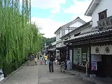 The old merchant quarter is called the Bikan historical area. It contains many fine examples of 17th century wooden warehouses (kura, 倉) painted white with traditional black tiles, along a canal framed with weeping willows and filled with koi. The area has no electric poles in order to make it more closely resemble the look of the Meiji period. One of the city's former town halls was located in the Kurashiki Kan, a European style building constructed in 1917.