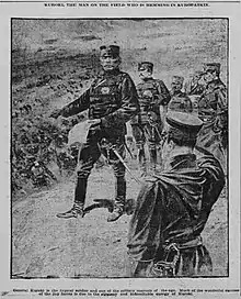 The military attaché of the British Indian Army to the Japanese First Army, General Sir Ian Hamilton, would directly apply lessons learned in Kuroki's retinue. In the 1915 Gallipoli Campaign he appointed Captain William Maxwell, a British journalist who had reported on the Russo-Japanese War for the London Daily Mail to be Chief Field Censor.[4] These experiences also provided a model that the U.S. military attaché, Captain John J. Pershing would adopt a decade later in Europe when he persuaded American journalist Frederick Palmer to take on the task of press accreditation for the American Expeditionary Force in France in World War I.[5] Palmer, like Pershing, had experienced the Russo-Japanese War through the restrictions Kuroki had imposed.
