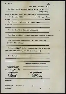 Death certificate of Kurt Nehrling, prisoner in Dachau Nazi Concentration Camp