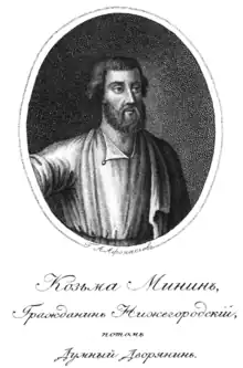 Kuzma Minin (Russian: Кузьма́ Ми́нин), full name Kuzma Minich Zakhariev-Sukhoruky (Russian: Кузьма́ Ми́нич Заха́рьев Сухору́кий; c.1570s – May 21, 1616), was a Russian merchant who, together with Prince Dmitry Pozharsky, organized a people's militia in Nizhny Novgorod to oust the Poles from Moscow in 1612.[1][2][3][4][5] As a result, they became national heroes for their role in defending the country.