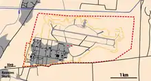 Kuweires base, red dashed line = base limits, buildings in black, aircraft shelters in red, defense lines during siege in orange