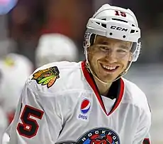 On July 2, 2014, Cumiskey returned to the NHL in signing a one-year two-way contract as a free agent with the Chicago Blackhawks.[7] Cumiskey started the 2014–15 season with the Blackhawks, but did not appear in any regular season games. On October 17, 2014, Cumiskey was assigned to the Rockford IceHogs, the Blackhawks' AHL affiliate, after clearing waivers. On February 13, 2015, Cumiskey was recalled by the Blackhawks and made his first return to the NHL since 2011 in featuring in a 3–1 victory over the New Jersey Devils.[8] He appeared in 7 scoreless games with Chicago before he was returned to end the regular season in the AHL. Cumiskey returned to Chicago to begin their playoff run, and made his post-season debut in the Conference finals against the Anaheim Ducks. Used in a depth defenseman role, Cumiskey was used sparingly but appeared in the first three Cup finals games against the Tampa Bay Lightning to help the Blackhawks claim the Stanley Cup.