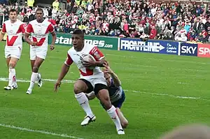 In 2008, he was given the number 24 jersey and made a spectacular early impression in the traditional Good Friday fixture with Wigan, scoring a late try and a goal.[8] He made 13 appearances in this season scoring 6 tries. He was then compared to Jason Robinson for his general attributes, and with his size finds it easy to duck under any oncoming opposition which helped him make 778m.