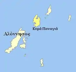 Kyra Panagia (Greek: Κυρά Παναγιά [ci'ra pana'ʝa]) is a Greek island in the Sporades archipelago, in the northern Aegean Sea. It is administratively part of the municipality of Alonnisos in the Sporades regional unit. The island is also known by the name of Pelagos and rarely Pelagonisi. In Antiquity it was known as Ephthyros (Έφθυρος) and Polyaigos (Πολύαιγος). A bay in the southwest of the island is named Agios Petros. Kyra Panagia has belonged to the Athonite monastery of Megisti Lavra, located on Mount Athos, since it was granted the island by the Byzantine emperor Nikephoros II Phokas in 963. There is a monastery renovated in 2017 after 8 years of work and inhabited by a single monk, on the east coast of the island. As of 2011, the resident population of the island was 2.[1] Kyra Panagia is in Zone B of the Alonnisos Marine Park.