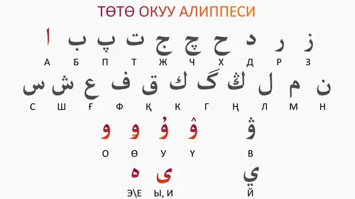 The tabel below illustrates the letter order for Kyrgyz as the letter order differs based on whether it is being written in the Arabic versus Cyrillic alphabet.