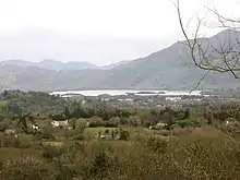 In Irish mythology, Lén was the craftsman of Síd Buidb, the 'sídhe of Bodb'.[1] The son of Ban Bolgach son of Bannach, he was said to reside under a lake near Killarney named Loch Léin after him. The Dindsenchas relate that Loch Léin was where he would make bright vessels for Fand the Long-Haired, the daughter of Flidais.[1] Every night, after finishing his work, it is written[1] that he used to fling his anvil away to a nearby hill called the Indeoin na nDési or 'Anvil of the Dési' and the showers that came from the back of the hill were said to be pearls off his anvil as it was flung.[1] Whether the name Lén can be philologically related to the Romano-Celtic god Lenus is disputable. While the meaning of the name is uncertain, the Old Irish words lén 'defeat, misfortune'[2] and lénaid 'injure, wound'[3] and the Welsh llwyn 'grove, bush, shrub'[4] may offer some basis for comparison.