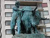 A bronze on a similar theme, his Le Dompteur de Taureaux (1881), which had been noticed at the retrospective exhibition of Belgian sculpture the previous year (in its plaster model), and was championed by Gustave Rolin-Jaequemyns, Minister of the Interior, stands on the Terrasses d'Avroy, Liège. Though a scarf had been added to the model to disguise the figure's nudity, the sculpture scandalised the editors of the Catholic daily, La Gazette de Liège.[1]