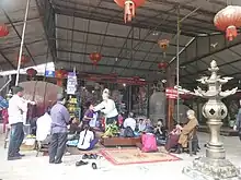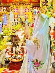 Lên đồng is commonly associated with Đạo Mẫu, Thánh Trần worship and Nội Đạo Tràng.[3] The date of lên đồng rituals are typically planned to coincide with a festival, anniversary, or the inauguration of a Mother house, although rituals may also be performed at more informal occasions. Rituals are generally held in temples, shrines or similarly sacred locations.[4] Joss paper—which may range from flowers, cakes and sweets to alcohol, cigarettes and jewelry—and, on certain occasions, even Coca-Cola cans[nb 1]—must be purchased.[2] Mediums generally also purchase a number of different costumes to be worn during the ritual. Before the main ritual takes place, mediums undergo several days of purifying rituals, involving abstention from sexual intercourse and eating meat.[2]