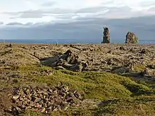 The Lóndrangar (Icelandic pronunciation: [ˈlounˌtrauŋkar̥]) are a pair of rock pinnacles in Iceland. They are volcanic plugs of basalt, that have been hewn out from softer surrounding rock by erosion. At 75 and 61 m tall, they are a singular sight, rising above and outside the ocean front due east across from Malarrif [ˈmaːlarˌrɪːf] and some 10 km from Hellnar, on the southern coast of Snæfellsnes peninsula. History has it that the taller of the cliffs was ascended in 1735, while the smaller one was not climbed until 1938.[1]
