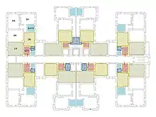 As per Havana zoning laws, the ground floor was required to have a porch facing 13th Street. It also had to provide public, commercial establishments. To this end, the building had various stores, a barbershop, restaurants and coffee shops. The distribution of the upper floors is as follows: from the second to the tenth floor, the building has eight apartments per floor, six with a separate service entrance opening directly into the kitchen and service area. Each apartment has access from the kitchen to what is called in Havana a "patio" (dark blue), this is an area equipped with a sink for doing laundry.[9] A similar room labeled a patio can also be found in other modernist buildings such as the FOCSA Building of 1956 and the apartments at the Edificio del Seguro Médico of 1958 on La Rampa. The four apartments in the center have two bedrooms each. The east and west apartments have three bedrooms each and an extra small maid's bedroom located next to the kitchen with a toilet and a shower. Each apartment has a small bathroom with a window close to the bedrooms. The main entrance door to the apartment opens directly into the living room. Only the apartments in the center block have a short corridor connecting the bedrooms. This shortage of corridors in the design mandates that the circulation occurs mostly through the rooms thus decreasing their effective square footage. The dining room is connected to the kitchen and the patio. The center apartments on the south side have a smaller entry vestibule. Every apartment was originally provided with modern amenities: hot and cold water, gas, radio, and telephone service. The López Serrano Building was the country's first co-operative apartment corporation.[10]