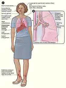 It is characterized by enlargement of the lymph nodes near the inner border of the lungs (called "hilar lymphadenopathy") as seen on x-ray, and tender red nodules (erythema nodosum) are classically present on the shins, predominantly in women. It may also be accompanied by arthritis (more prominent in men) and fever. The arthritis is often acute and involves the lower extremities, particularly the ankles.[2]