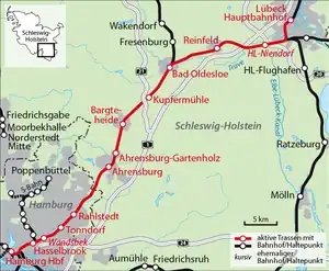 The Hamburg–Lübeck railway is one of the most important mainline railways of the German states of Schleswig-Holstein and Hamburg. It connects the two Hanseatic cities of Hamburg and Lübeck, and is part of the line to Denmark. The line was opened in 1865.
