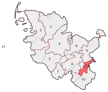 Lübeck is located in southern Schleswig-Holstein. As of the 2021 federal election, it comprises the urban district of Lübeck and the Ämter of Berkenthin and former Amt of Sandesneben from the Herzogtum Lauenburg district.[1]