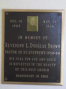 "Father Brown was a man of vision and also a man who was prepared to take the action to see that it was accomplished. Without a doubt he will always be remembered as the man who brought the long time dream of a separate school to reality. He oversaw the building of St. Stephen's School as well as the Bishop McCarthy School on Highway 56, in Seneca Township. With change always comes uncertainty, and St. Stephen's was to go through a troubled time until the community accepted the change to a two school system. A benevolent person, he often used his own resources to achieve what the parish or diocese could not afford at the time. This included a free dental clinic in the basement of the rectory, as well as major and beautiful changes to the sanctuary and church as a whole. Along with an addition to the sacristy, Italian marble and beautiful art work adom St. Stephen's today. Father Brown also worked hard to increase attendance and return those to the fold who had drifted away. He was a very social person and had many functions like the Open House at the new rectory in September of 1956, as no formal ceremony had been held since its erection. A community-minded priest, he gave land for the new Scout Hall and underwrote the cost of many church, school, and community project. In the midst of his active priesthood, he was diagnosed with cancer and became ill in 1963 and was assisted by Father Cartwright. Father Brown died in 1964 and was buried in Holy Sepulchre Cemetery in Hamilton. Bronze plaques commemorate this priest and his achievements and are mounted in the entrance to St. Stephen's Church as well as St. Stephen's School." [2]