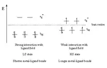 Many transition metal complexes with electronic configuration d4-d7 are capable of spin crossover (and d8 when molecular symmetry is lower than Oh).[2] Spin crossover refers to where a transition from the high spin (HS) state to the low spin (LS) state or vice versa occurs. Alternatives to LIESST include using thermal changes and pressure to induce spin crossover. The metal most commonly exhibiting spin crossover is iron, with the first known example, an iron(III) tris(dithiocarbamato) complex, reported by Cambi [3] et al. in 1931.