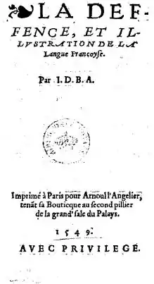La Défense et illustration de la langue française (English: The defense and illustration of the French language) is a literary theory text written during the Renaissance in 1549 by the French poet Joachim du Bellay. It was a manifesto of the ideas of the group originally known as La Brigade, later as La Pléiade. Du Bellay called for "the enrichment of the French language by discreet imitation and borrowing from the language and literary forms of the classics and the works of the Italian Renaissance... In it he asserted that French (was) capable of producing a modern literature equal in quality and expressiveness to that of ancient Greece and Rome."[1]