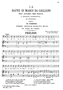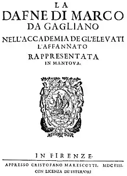 La Dafne (Daphne) is an early Italian opera, written in 1608 by the Italian composer Marco da Gagliano from a libretto by Ottavio Rinuccini. It is described as a favola in musica (fable set to music) composed in one act and a prologue. The opera is based on the myth of Daphne and Apollo as related by Ovid in the first book of the Metamorphoses. An earlier version of the libretto had been set to music in 1597–98 by Jacopo Peri, whose Dafne is generally considered to be the first opera.[1]
