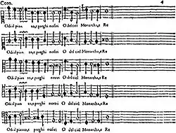 The text is 445 lines in total. While short, it offers heightened emotions and dramatic opportunities, including the eight stanza chorus that celebrates the nymph's flight from Apollo's attack called, ‘Bella ninfa fugitive.’[8] Typical of composition techniques at the birth of Italian opera, Gagliano set Rinuccini's text of Dafne with homophonic choruses intertwined with intermittent choral polyphony. His homophonic choruses, though lacking in a unified textual theme, did provide textual clarity, highlighting the importance of comprehensible singing, especially when setting moral text. This is typified in the opening scene of Dafne through a five-part chorus of the text “Hear our plaint and prayer, O Monarch and King of Heaven.” The chorus is a prominent figure throughout the composition, at times adding to the action of the story and at other times, providing reflective commentary.