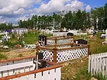 Another map by the archaeologist Don Steer in 1972[13] shows the locations and the dates of seven of these posts. North West Company posts were located on the large peninsula called 'Big Point' (circa 1789-91) and on the south west side of the lake (1819–21). A Hudson's Bay post was located at the mouth of the portage in 1810. Transportation depots were located at each end of the portage from the 1820s to 1880s. In 1857 a permanent trading post was built on the south end of the Portage. This post moved to nearby West La Loche in the 1870s until it was destroyed by fire in 1936. The HBC relocated their post across the lake at La Loche in the newly purchased Revillon Frères buildings where they remained until they sold their northern stores in 1987. The Revillon Frères post had been in La Loche since 1906.[14]