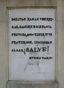 Text by Rubén Darío ("Salutación del optimista", 1905) inscribed on the Monumento a la Raza in Seville (1929). Translation: 'Illustrious, most fruitful races, fecund blood of Hispania, fraternal spirits, lumious souls, greetings!'